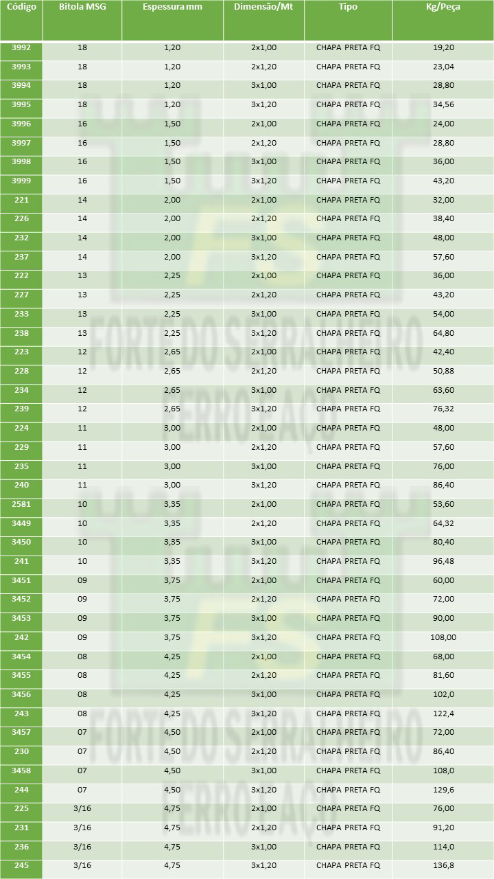 Tabela chapa fina quente (FQ) Medidas comercializadas: